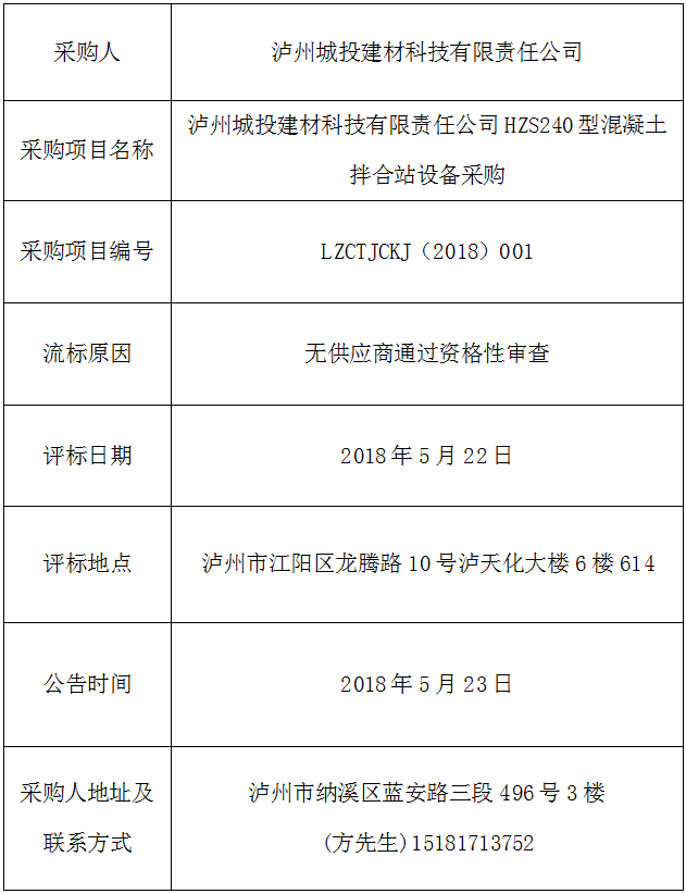 建材公司關(guān)于HZS240型混凝土拌合站設(shè)備采購流標(biāo)公告