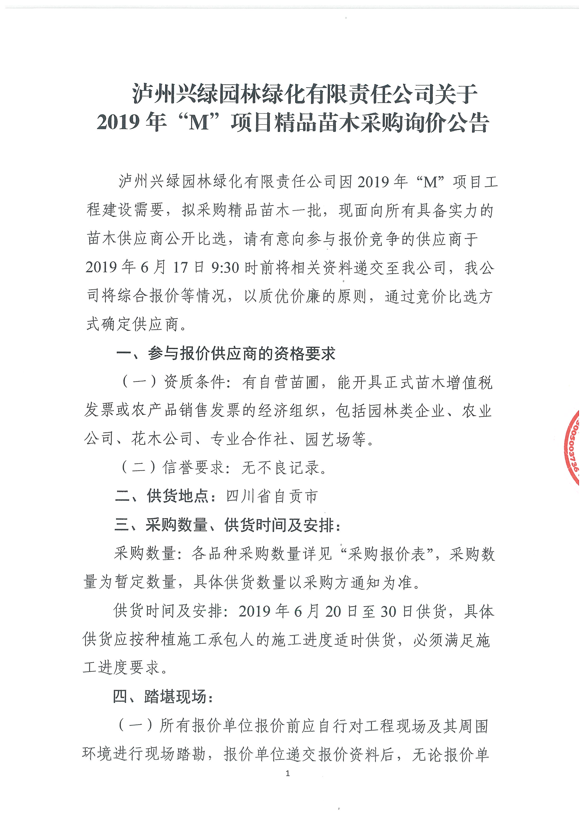2019年“M”項目精品苗木采購詢價公告