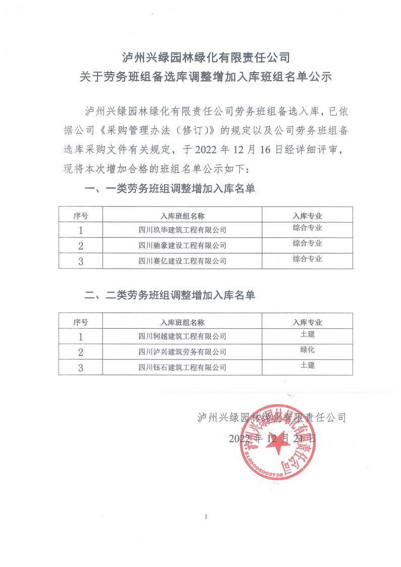勞務(wù)班組備選庫調(diào)整增加入庫班組名單公示