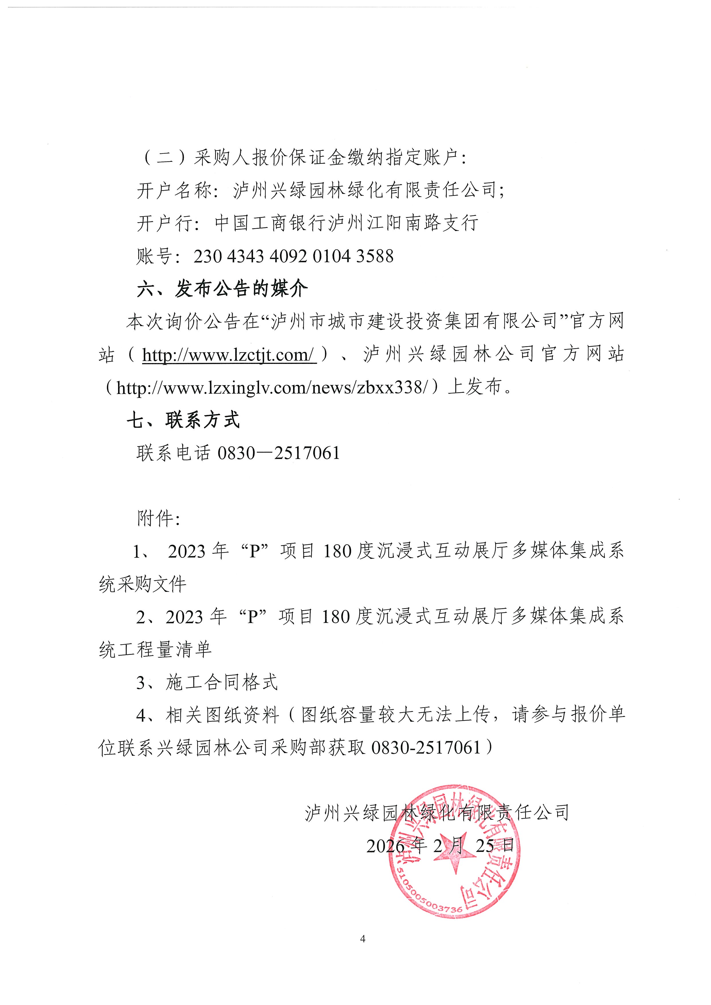 瀘州興綠園林綠化有限責(zé)任公司關(guān)于 2023年“P”項(xiàng)目180度沉浸式互動(dòng)展廳多媒體集成系統(tǒng)項(xiàng)目采購(gòu)公告
